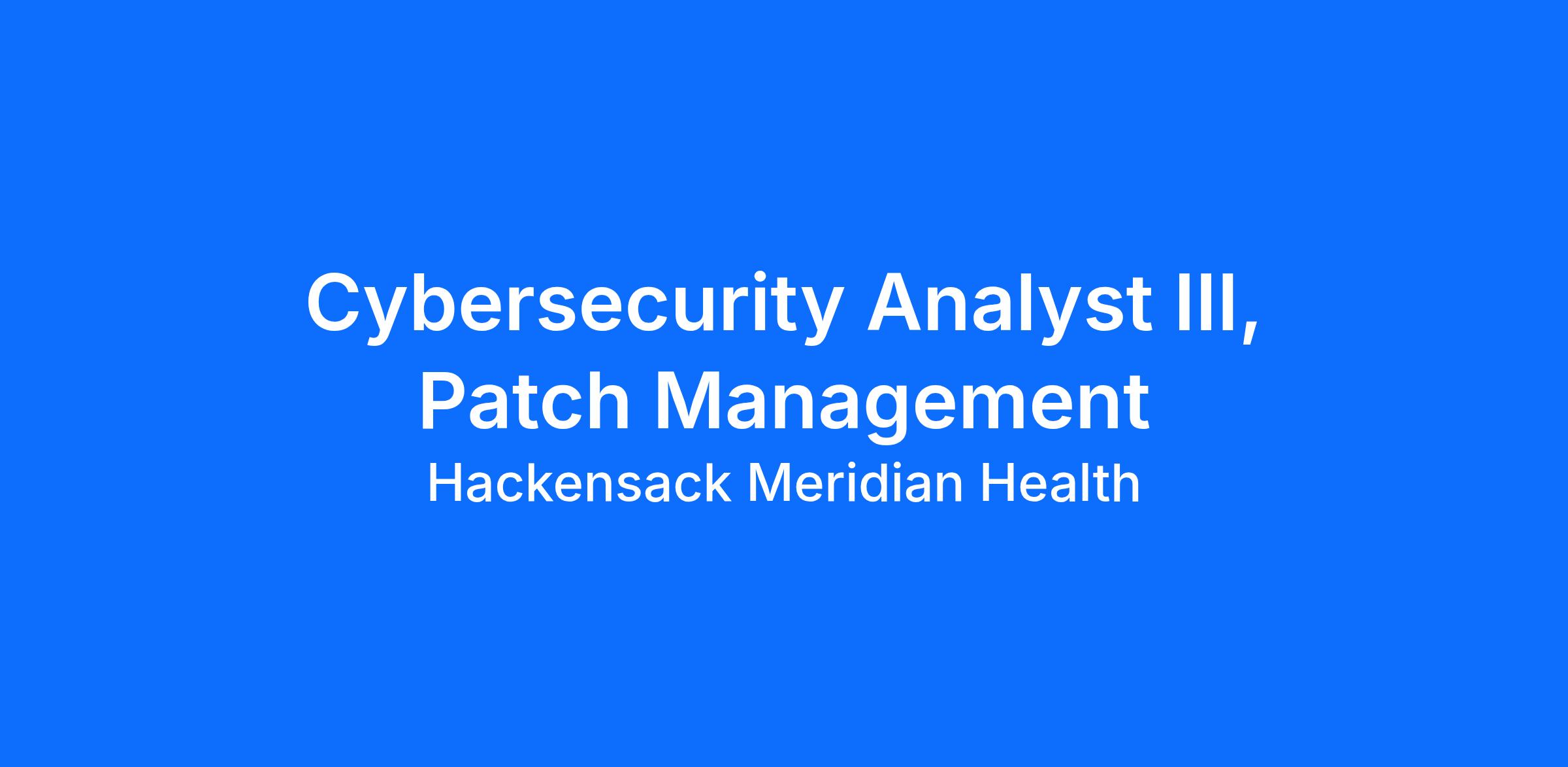 The Patch Management (PM) Cybersecurity Analyst III is responsible for the effective execution and enhancement of Hackensack Meridian Health's (HMH) PM program. Coordinate the testing, deployment, and verification of security patches and updates to HMH systems and applications. Involves collaboration with Digital Technology Services (DTS)/Information Technology (IT) teams, system owners, and vendors to support patch compliance and system stability.