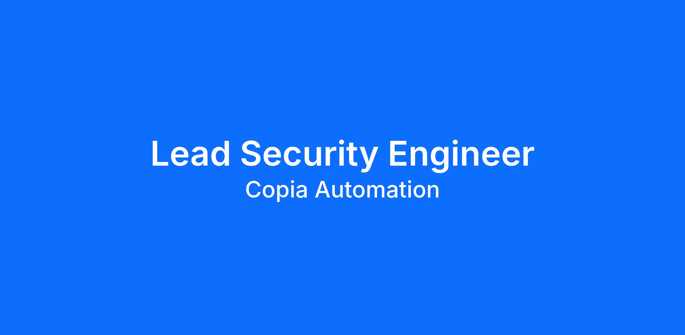 We’re hiring a Lead Security Engineer to mature Copia’s security engineering program. You’ll work closely with our CISO and report into engineering leadership.